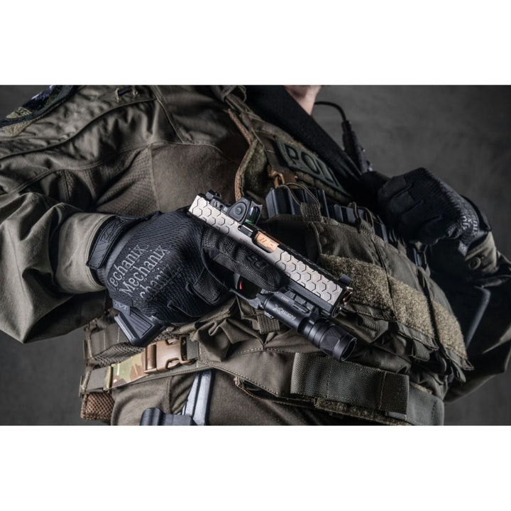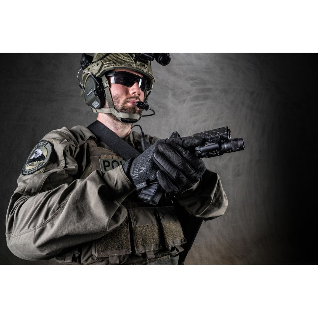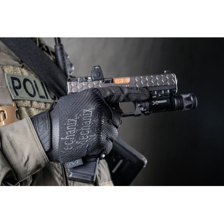 Close-up of police operator wearing Mechanix 0.5mm gloves in black while aiming pistol with tactical light