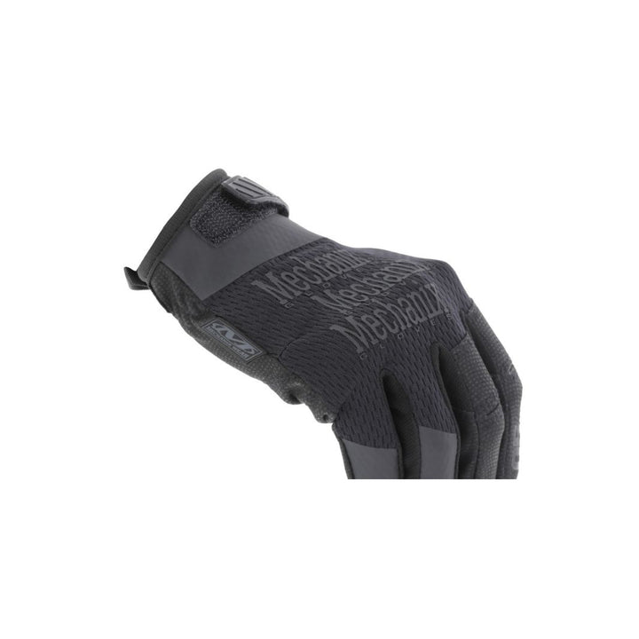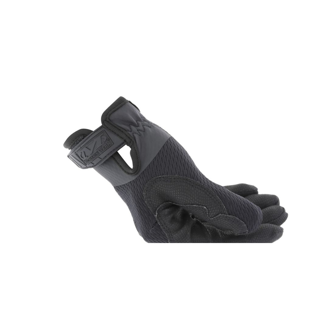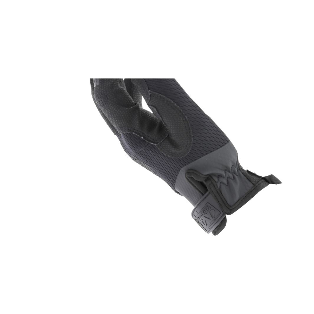 Close-up of Mechanix 0.5mm glove in black showing wrist strap and logo on closure tab